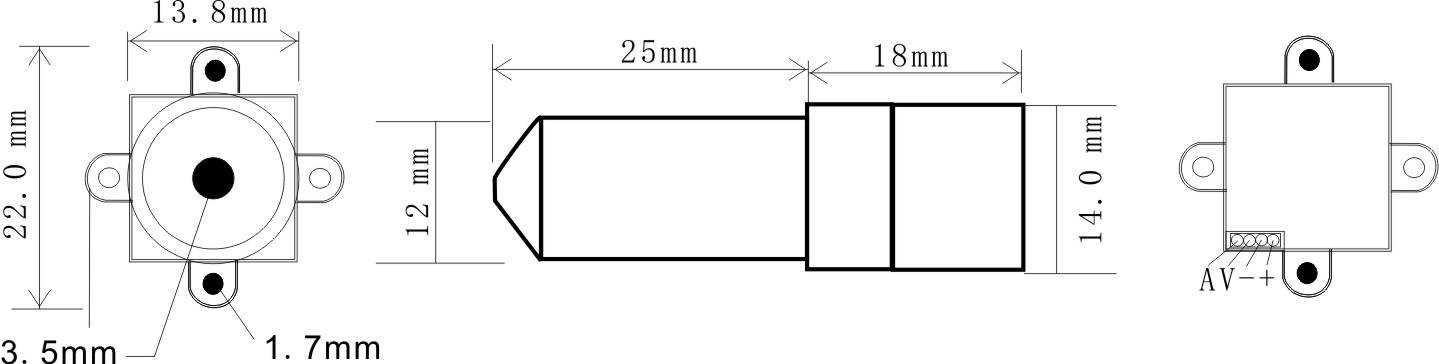 | Connection: | PIN1->Red DC5V PIN2->Black GND PIN3->Yellow VIDEO OUT PIN4->White AUDIO OUT | |